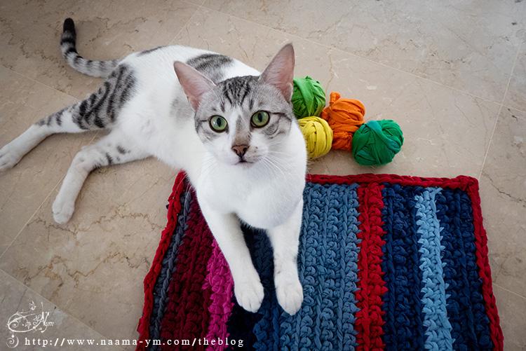 את השטיחון מדגמן אחד החתולים, דיפר. לידו יש כמה סלילים של חוטים מוכנים לפרוייקט הסריגה הבאה.